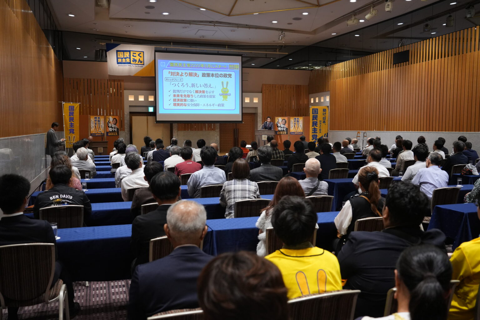 続いて行われた党員・サポーター集会にて、玉木代表は冒頭、先般の参議院選挙に触れ、京都府内での比例票は12万4,000票を超え、3年前の参院選から2.25倍に増加したと報告。また、全国的にも比例票が大きく伸び、結党から5年を迎えた党が着実に歩みを進めていると強調した。
