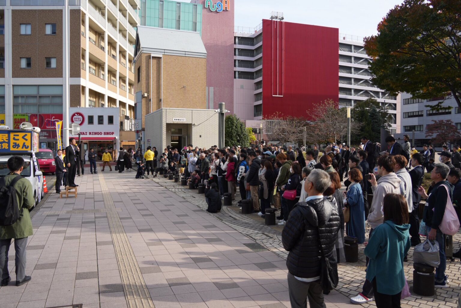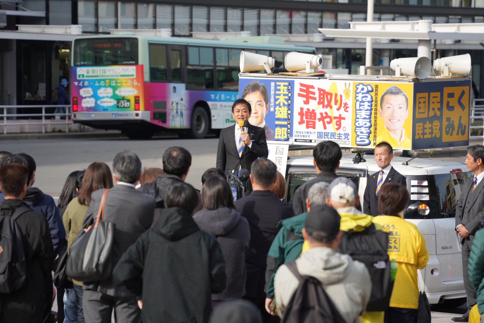 集会と説明会の後に行われた街頭演説では、玉木代表が金濱県連代表とともにマイクを握り、青森県内における党勢拡大の意気込みを熱意をもって訴えた。