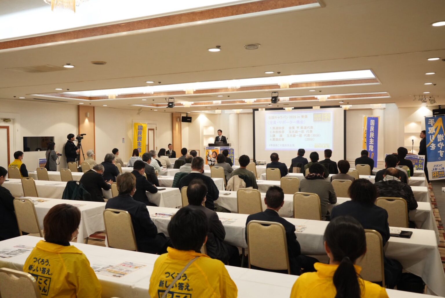 続いて玉木代表は「青森県では車がないと生活できない。ガソリン暫定税率廃止を何としても年内に実現したい」と政策実現への意気込みを語るとともに、党の地力をつける必要性に触れ、「青森県は地方議員空白県の一つだ。2026年11月の青森市議会議員選挙で、必ず議員を誕生させたい。そのためにも、皆さんのご理解ご協力をお願いしたい」と支援を呼びかけた。